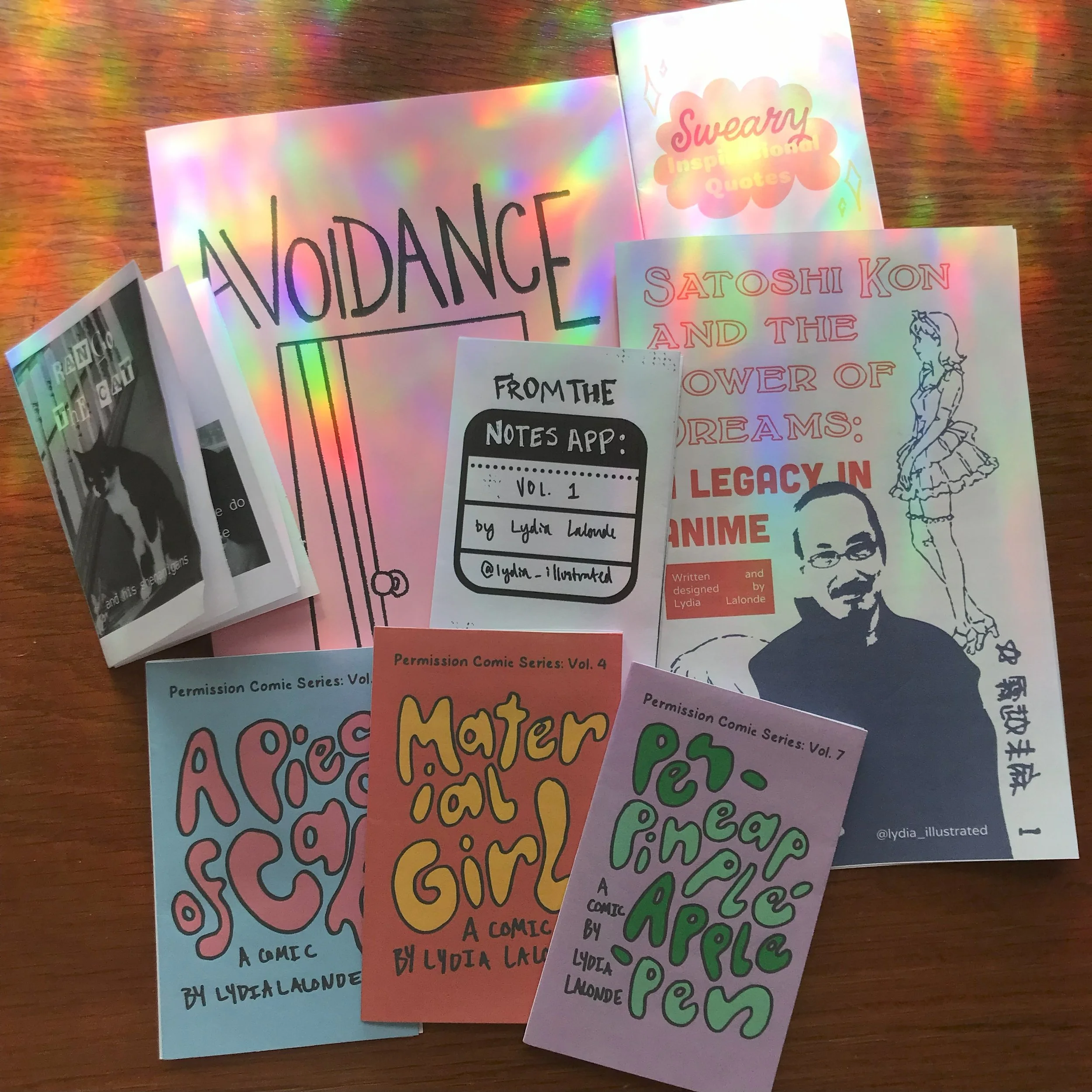 I began creating zines as a research project for a Graphic Design history project and it all continued from there. Zines are self-published publications that can be about anything and come in many different shapes and sizes. My first zine was my, Zine of Zines, which was a research paper turned zine about zine history. I went from there and developed my Permission Comic series of comic zines. My zines have been a way to express my creativity, utilize my design skills, and share my interests and stories.